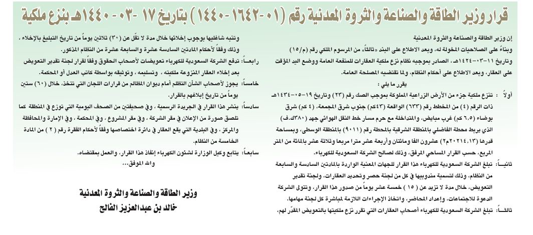 جريدة أم القرى Pa Twitter في عدد 4753 قرار وزير الطاقة والصناعة والثروة المعدنية رقم 01 1206 1440 بتاريخ 26 02 1440هـ بنزع ملكية Https T Co Oapc7edopp Https T Co Qipmb61mz9