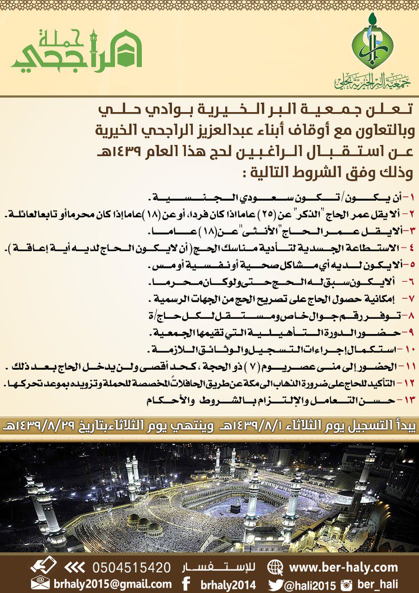 트위터의 بر حلي 님 شروط التسجيل بحملة الحج عن طريق جمعية البر الخيرية بوادي حلي علما بأن التسجيل يبدأ من ١ ٨ الى ٢٩ ٨